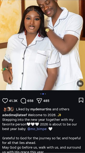 In his New Year message, Lateef Adedimeji described Mo Bimpe as his “favourite person” and emphasized the importance of walking into the new season together. He acknowledged God’s faithfulness throughout their journey as a couple and expressed hope for greater achievements, peace, and divine guidance in 2026.