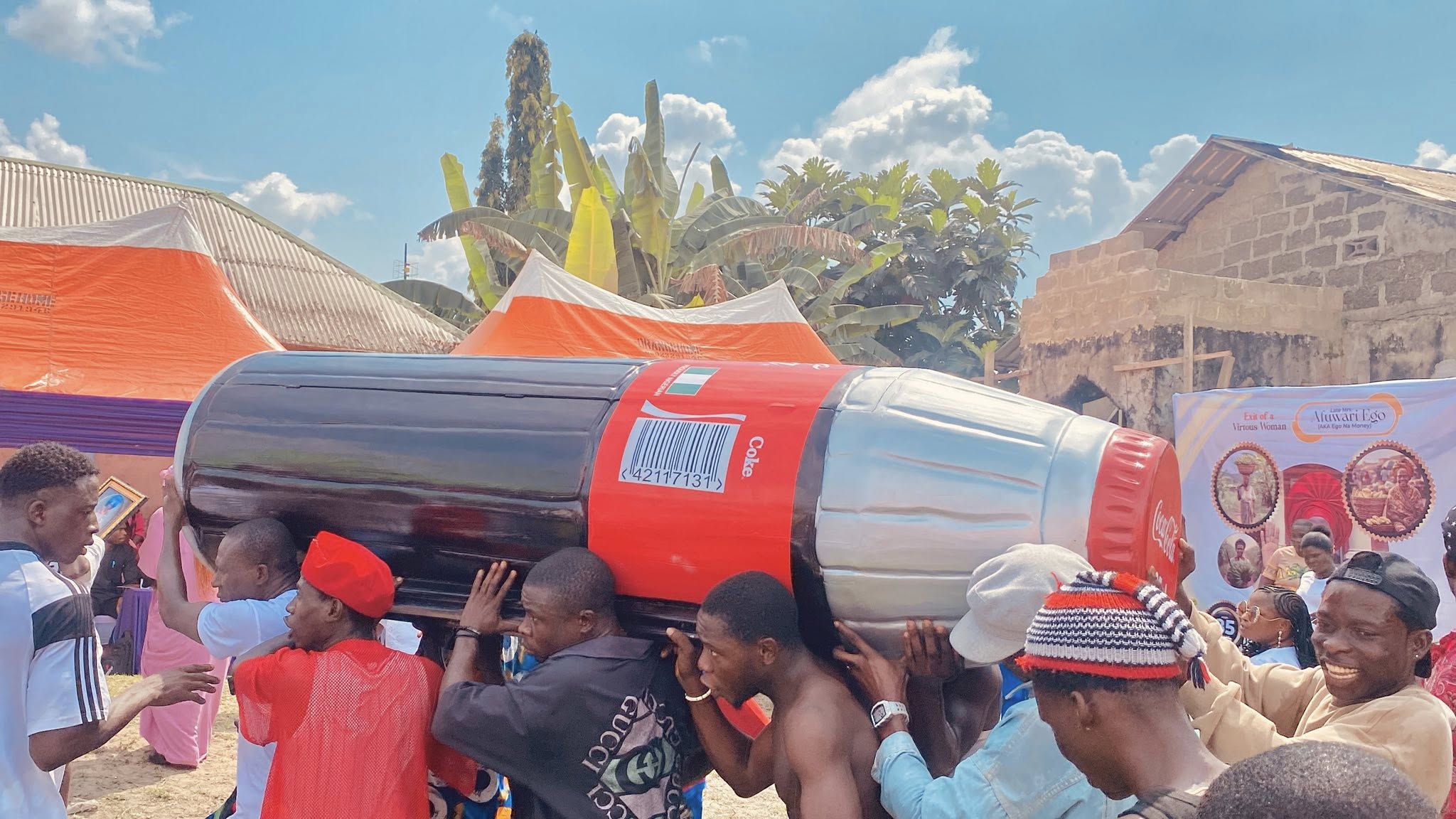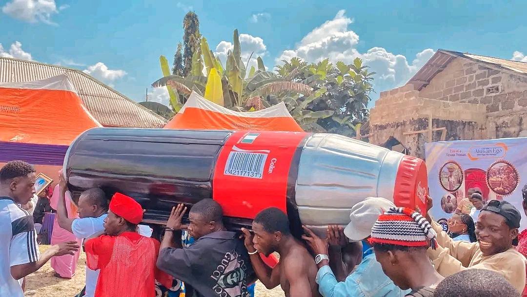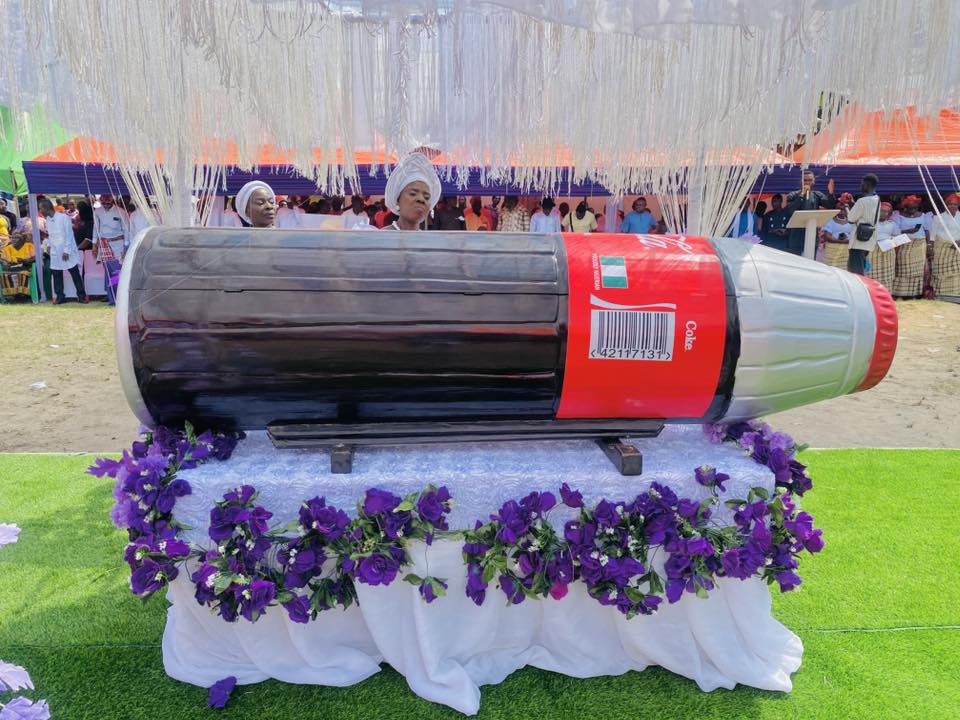 A woman, Late Madam Afuwari Ego a.k.a Ego Na Money, was laid to rest in a uniquely designed Coca-Cola bottle-shaped casket in Emeyal 1 community, Ogbia Local Government Area of Bayelsa State.