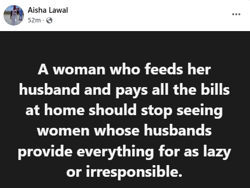 “A woman who feeds her husband and pays all the bills at home should stop seeing women whose husbands provide everything for as lazy or irresponsible,” she wrote in a Facebook post on Monday.