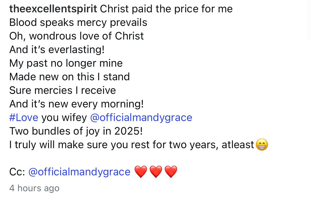 #Love you wifey @officialmandygrace. Two bundles of joy in 2025! I truly will make sure you rest for two years, atleast”