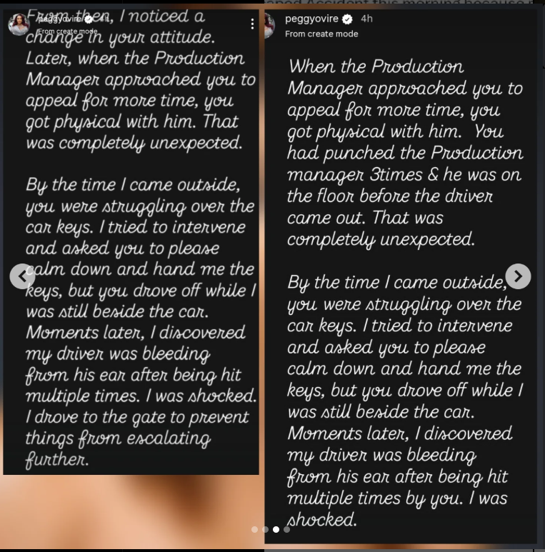 In her post, Peggy accused Taye of physically assaulting two crew members during a film shoot. According to her, the incident started when the crew pleaded with him to complete two short scenes so they could wrap up filming for the night.