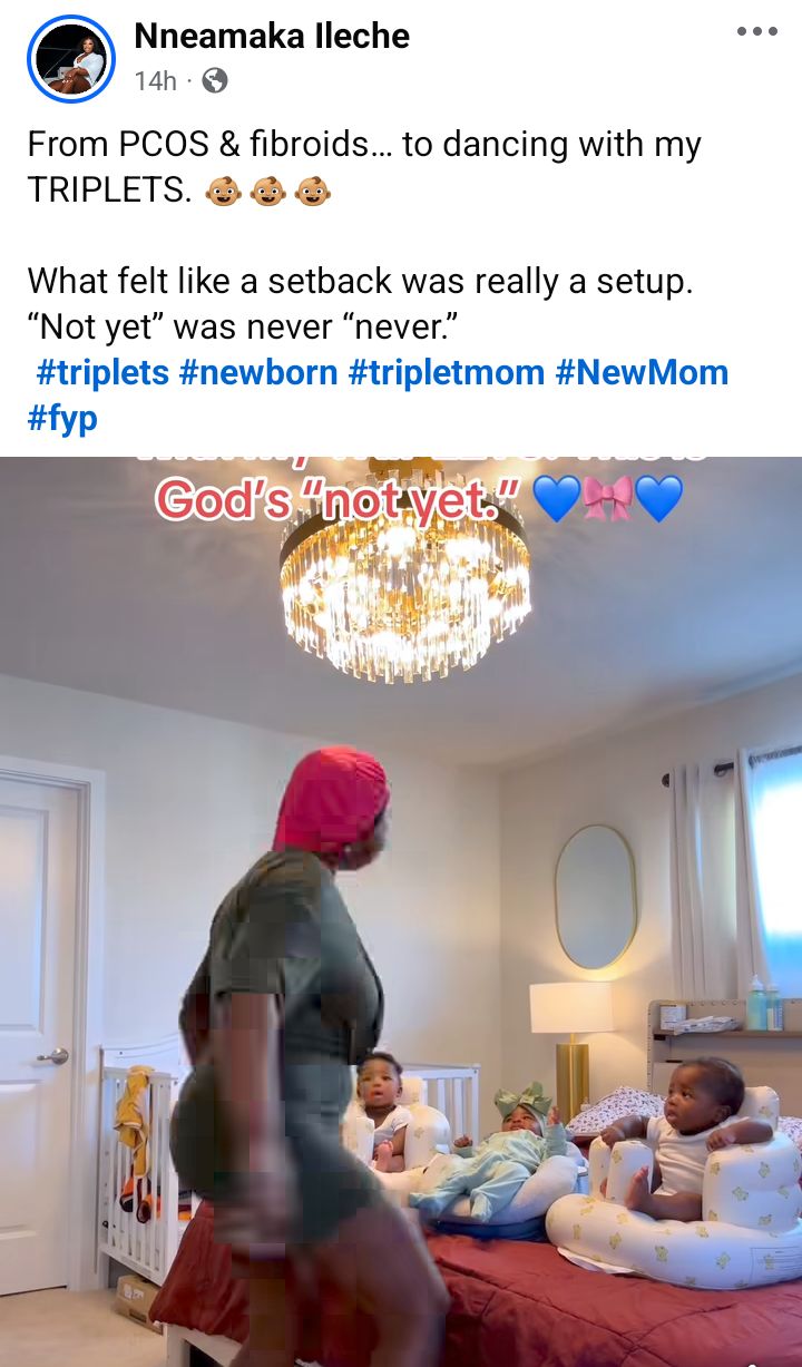 A US-based Nigerian woman, Nneamaka Ileche, who welcomed triplets after years of waiting, a difficult journey with PCOS, and fibroid, has shared her testimony.