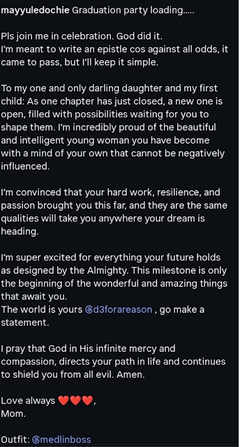 Sharing her joy with fans and supporters online, May revealed that she initially intended to write a long epistle because of everything they had endured as a family. However, she chose to keep it simple while still honoring the significance of the moment. She showered praises on Danielle, commending the young graduate for blossoming into a confident, intelligent, and principled woman who cannot be easily influenced negatively.