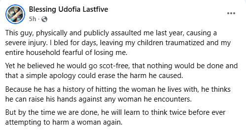 “This guy, physically and publicly assaulted me last year, causing a severe injury. I bled for days, leaving my children traumatized and my entire household fearful of losing me. Yet he believed he would go scot-free, that nothing would be done and that a simple apology could erase the harm he caused. Because he has a history of hitting the woman he lives with, he thinks he can raise his hands against any woman he encounters. But by the time we are done, he will learn to think twice before ever attempting to harm a woman again,” she wrote.