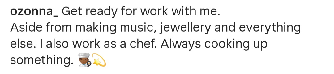 In the caption, he wrote: “Get ready for work with me. Aside from making music, jewellery and everything else. I also work as a chef. Always cooking up something.”