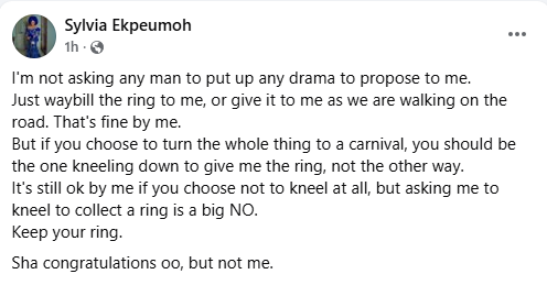 “I’m not asking any man to put up any drama to propose to me. Just waybill the ring to me, or give it to me as we are walking on the road. That’s fine by me. But if you choose to turn the whole thing to a carnival, you should be the one kneeling down to give me the ring, not the other way. It’s still ok by me if you choose not to kneel at all, but asking me to kneel to collect a ring is a big NO. Keep your ring. Sha congratulations oo, but not me,” she wrote in a Facebook post on Thursday.