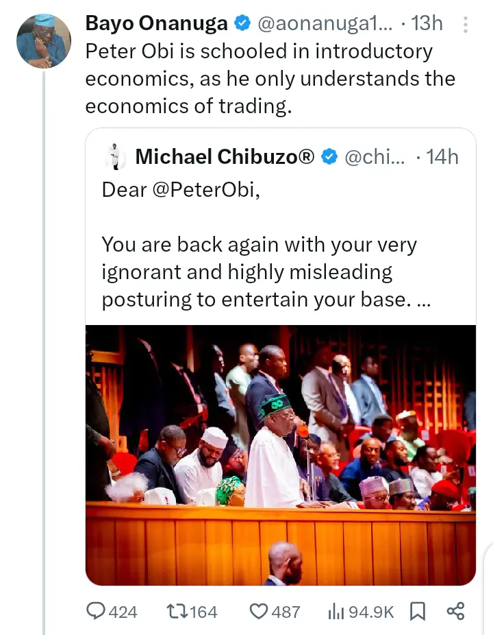 His reaction is coming after Bayo Onanuga mocked the former governor of Anambra state saying that the only economics he understands is trading economics.