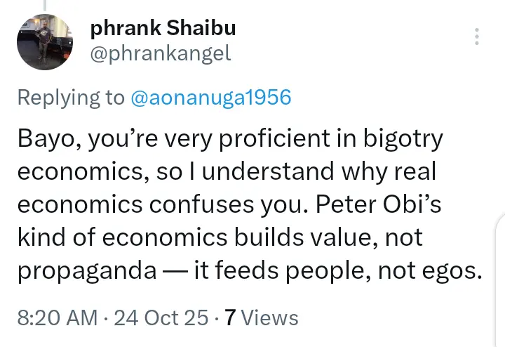 “Bayo, you are very proficient in bigotry economics, so I understand why real economics confuses you. Peter Obi’s kind of economics builds value, not propaganda, it feeds people, not egos”.