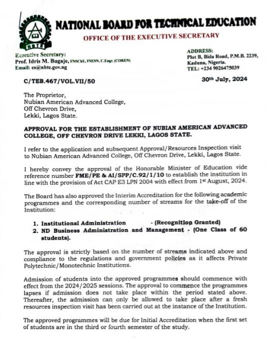 The National Board for Technical Education has approved the establishment of Nubian American Advanced College, with effect from August 1,…