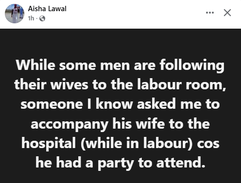 A Nigerian lady, Aisha Lawal, has recalled when a man asked her to follow his pregnant wife to the hospital…