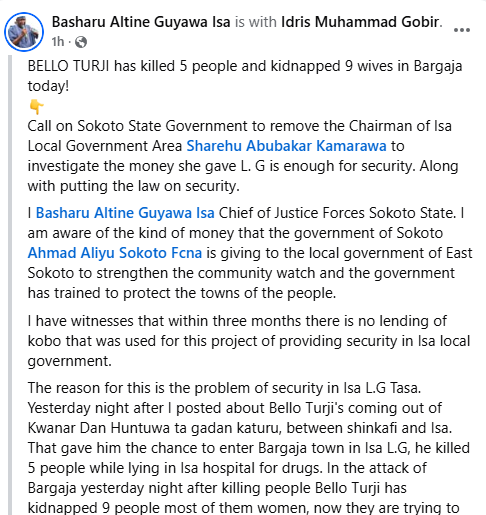 “Yesterday night, bandits loyal to Bello Turji stormed Bargaja village in Isa LGA, Sokoto State, leaving several people d3ad,” he wrote.