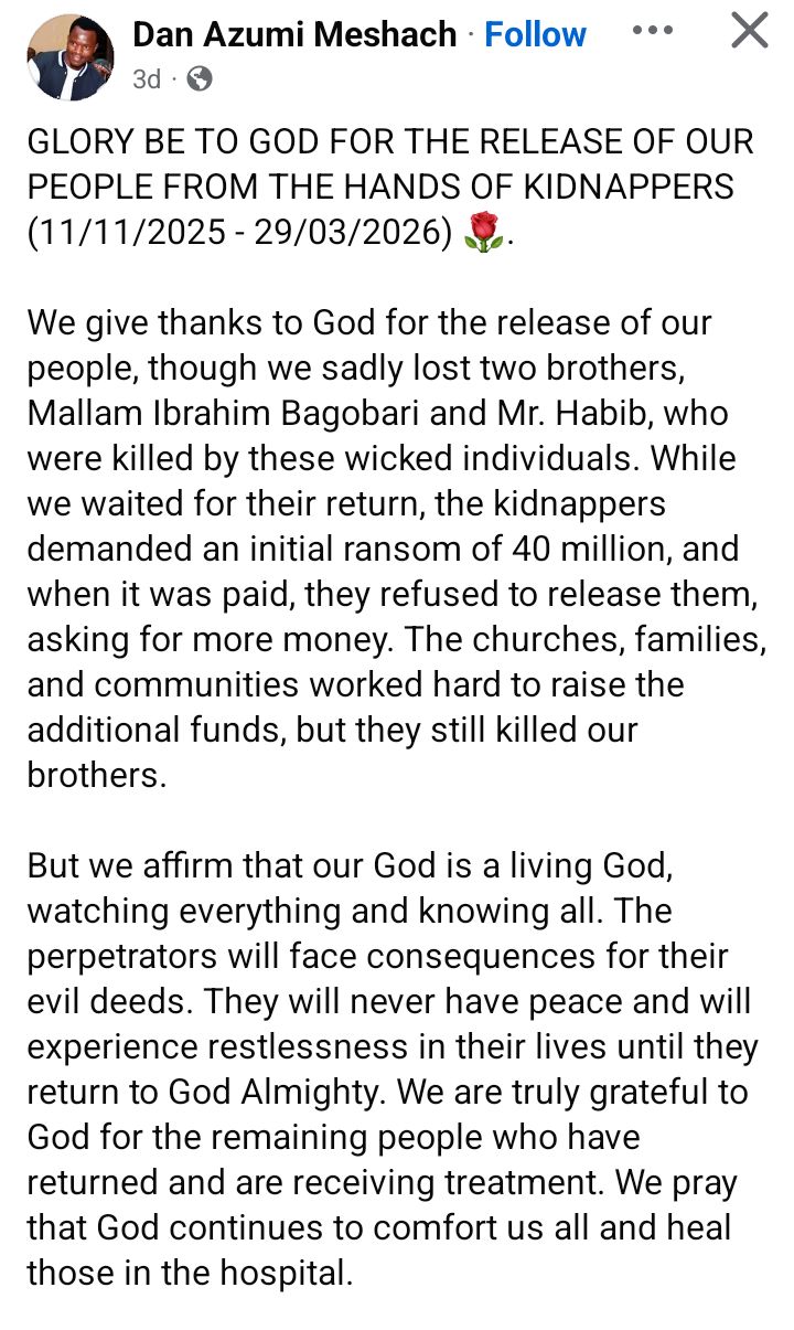 “We give thanks to God for the release of our people, though we sadly lost two brothers, Mallam Ibrahim Bagobari and Mr. Habib, who were k!lled by these wicked individuals,” he wrote.