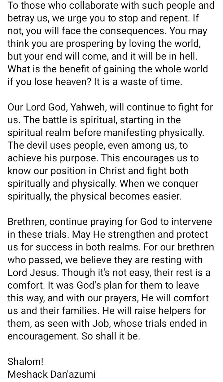 Brethren, continue praying for God to intervene in these trials. May He strengthen and protect us for success in both realms. For our brethren who passed, we believe they are resting with Lord Jesus. Though it’s not easy, their rest is a comfort.