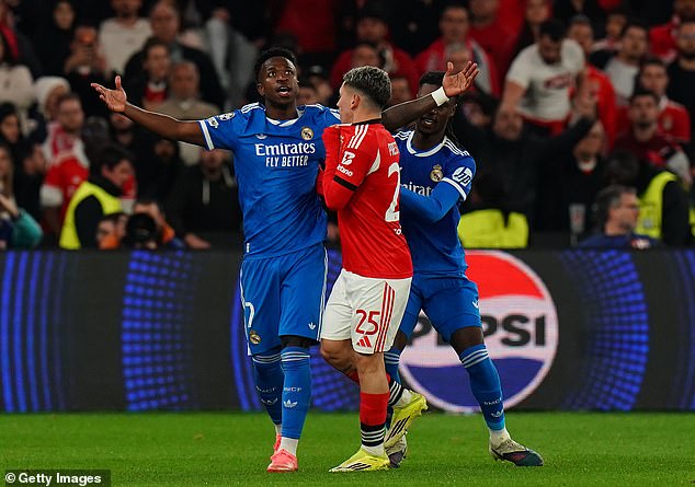 Prestianni is alleged to have directed the word ‘mono’, Spanish for ‘monkey’, at Vinicius after the Brazilian’s mocking celebration in front of the Benfica supporters.