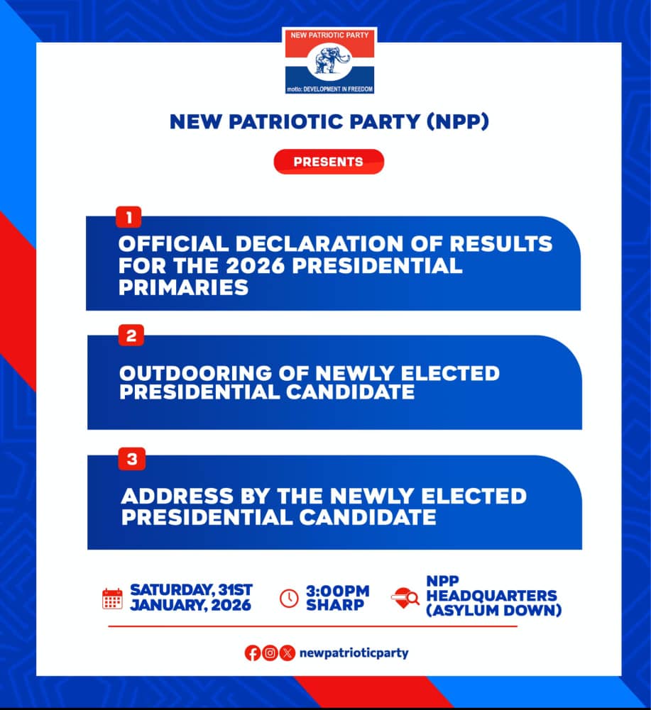 The New Patriotic Party (NPP) is set to officially declare the outcome of its 2026 presidential primaries and formally present…