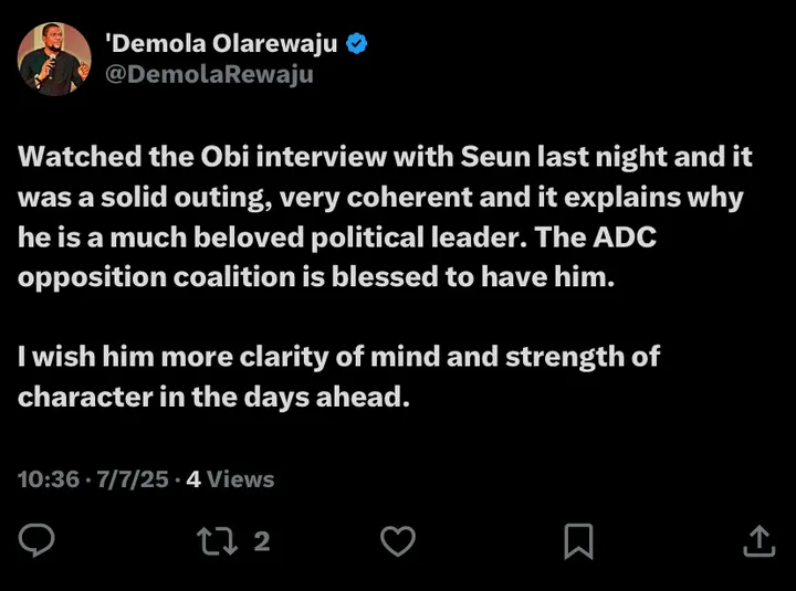 A top aide to former Vice President Atiku Abubakar, Demola Olarewaju, has praised the recent Channels Television interview featuring Peter…