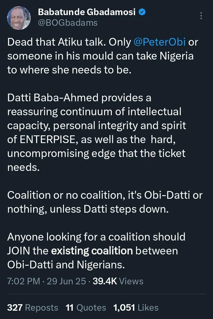 Babatunde Gbadamosi, a prominent figure within the Peoples Democratic Party (PDP) and former Lagos East senatorial candidate, has categorically ruled…