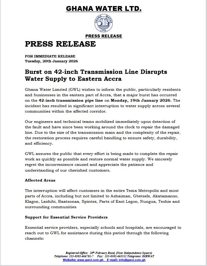 Residents across the Tema Metropolis and several communities in Accra are bracing for days of disrupted water supply after a…