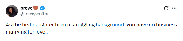 A Nigerian lady, Preye, has said that first daughters from poor families should prioritize financial stability over love when choosing…