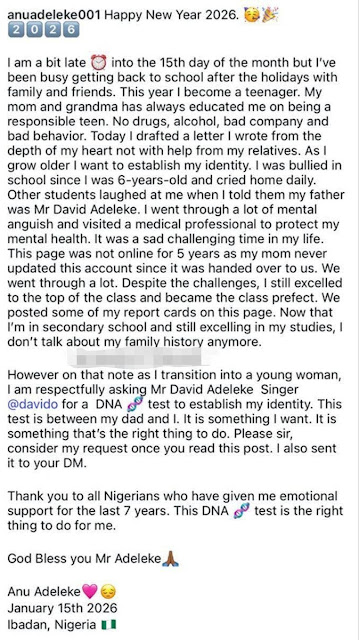 In a heartfelt New Year message shared on social media, Anu opened up about her childhood struggles, academic journey, and emotional pain, while respectfully asking the award-winning singer to agree to a DNA test. The post, dated January 15, 2026, was shared from Ibadan, Nigeria, and has since gone viral across social media platforms, drawing mixed reactions from fans and Nigerians at large.