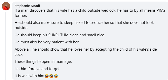 “If a man discovers that his wife has a child outside wedlock, he has to by all means PRAY for her. He should also make sure to sleep naked to seduce her so that she does not look outside. He should keep his SUKRUTUM clean and smell nice. He must also be very patient with her. Above all, he should show that he loves her by accepting the child of his wife’s side cock. These things happen in marriage. Let him forgive and forget. It is well with him,” one Stephanie Nnadi wrote.