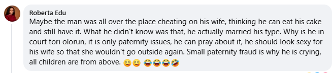 One Roberta Edu wrote: “Maybe the man was all over the place cheating on his wife, thinking he can eat his cake and still have it. What he didn’t know was that, he actually married his type. Why is he in court tori olorun, it is only paternity issues, he can pray about it, he should look sexy for his wife so that she wouldn’t go outside again. Small paternity fraud is why he is crying, all children are from above.”