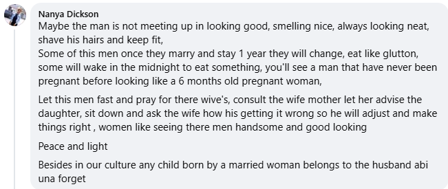 “Maybe the man is not meeting up in looking good, smelling nice, always looking neat, shave his hairs and keep fit, Some of this men once they marry and stay 1 year they will change, eat like glutton, some will wake in the midnight to eat something, you’ll see a man that have never been pregnant before looking like a 6 months old pregnant woman, Let this men fast and pray for there wive’s, consult the wife mother let her advise the daughter, sit down and ask the wife how his getting it wrong so he will adjust and make things right , women like seeing there men handsome and good looking Peace and light Besides in our culture any child born by a married woman belongs to the husband abi una forget,” another wrote.