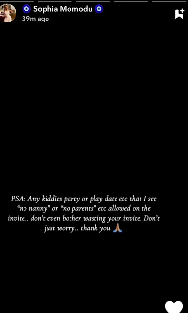 Taking to her Instagram story, Sophia Momodu addressed individuals and event hosts who frequently send out invitations for kids’ parties, playdates, and social gatherings while placing restrictions on adult supervision. According to the fashion content creator, she will not allow her daughter, Imade, to attend any event where her parents or a nanny are not permitted to be present.