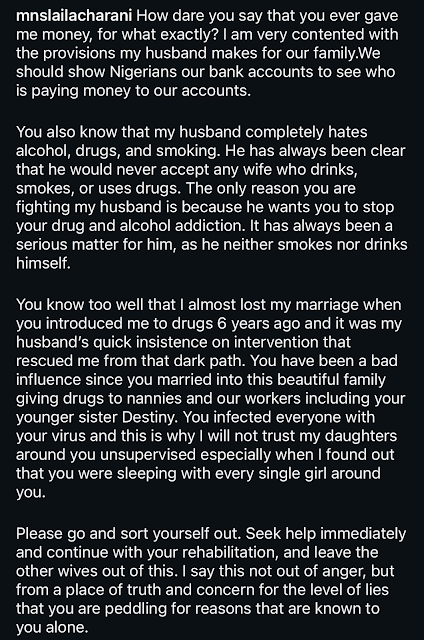 “Please go and sort yourself out. Seek help immediately and continue with your rehabilitation, and leave the other wives out of this,” Laila warned. “I say this not out of anger, but from a place of truth and concern for the level of lies that you are peddling.”