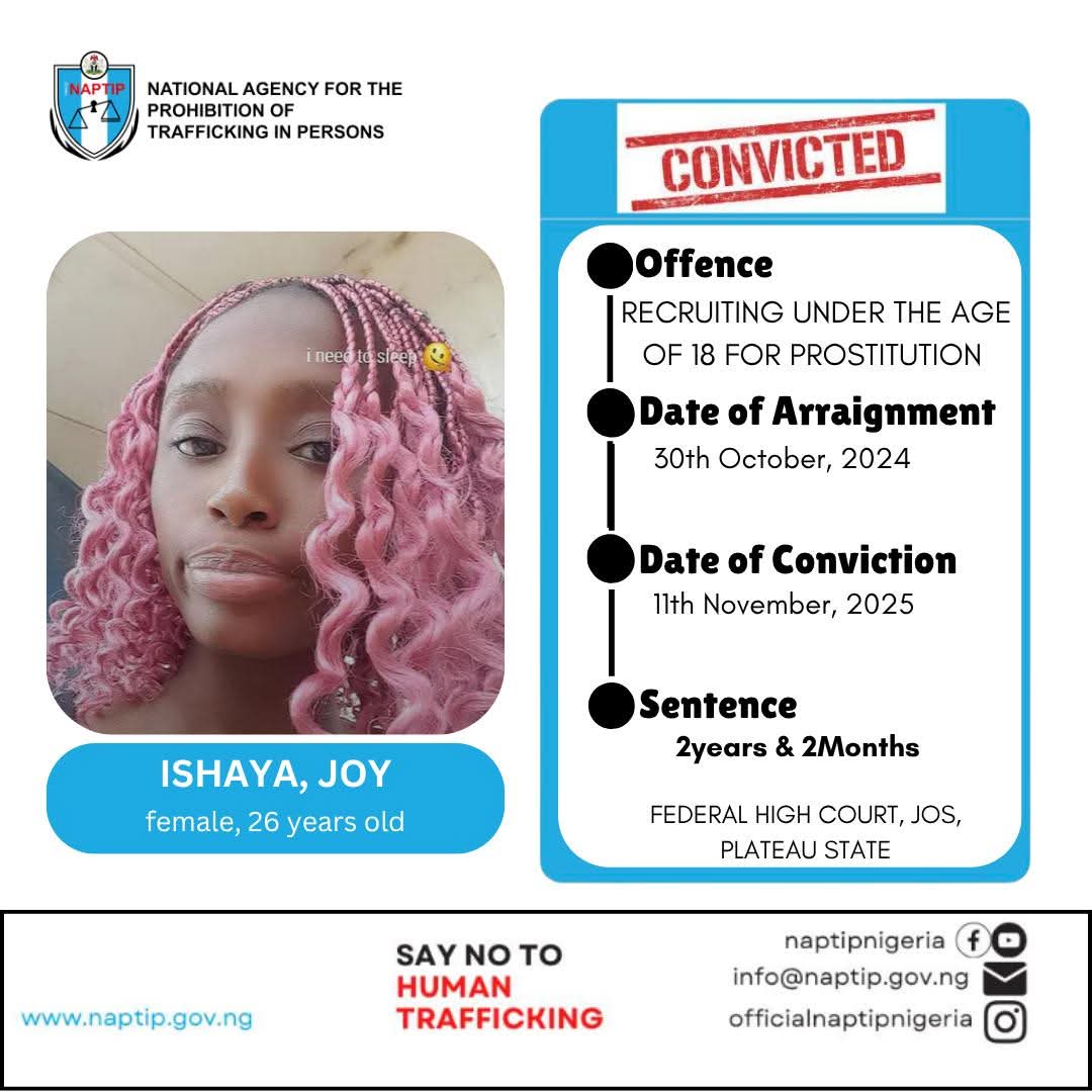 A Federal High Court in Jos, Plateau State, has convicted two defendants for recruiting a person under 18 for prostitution, facilitating foreign travel to promote prostitution, and conspiring to facilitate such travel.