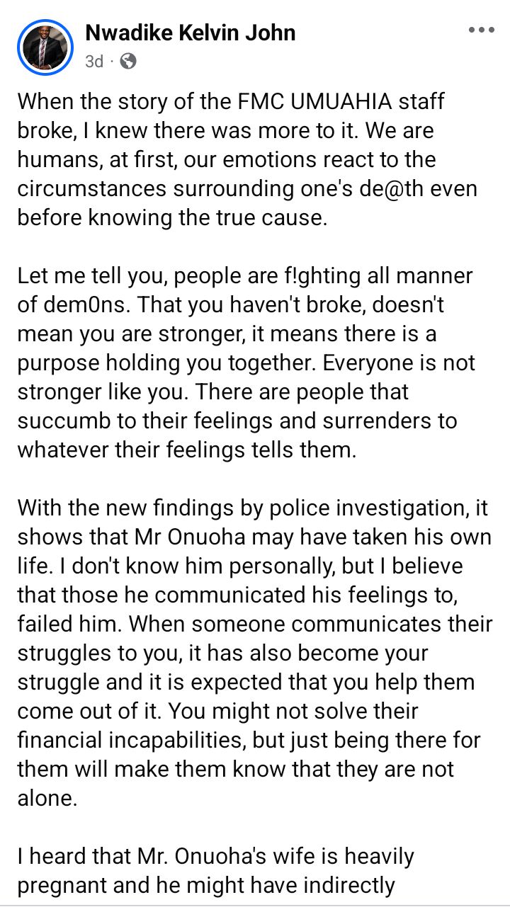 A junior staff of Federal Medical Centre, FMC, Umuahia, Abia State, Ikenna Onuoha, allegedly committed suic!de.