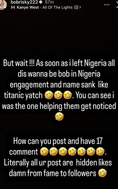 “But wait!!! As soon as I left Nigeria all dis wanna be Bob in Nigeria engagement and name sank like Titanic yacht. You can see I was the one helping them get noticed. How can you post and have 17 comment? Literally all ur post are hidden. Likes damn, from fame to followers.”
