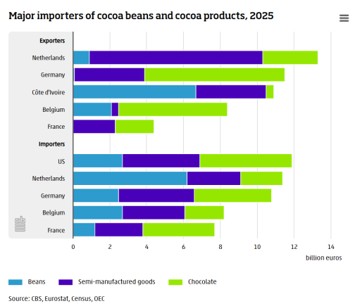 The CBS data indicates that nearly three-quarters of Dutch cocoa exports consist of semi-finished products, with the remainder made up of finished goods. These intermediate products are largely used by manufacturers in other countries to produce chocolate and related items.
