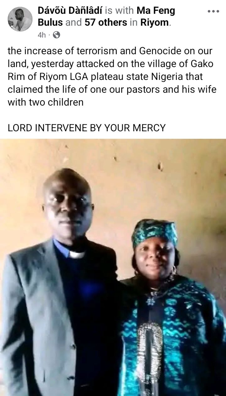 Gunmen have k!lled a pastor of the Evangelical Church Winning All (ECWA), his wife and their two children in Gako village, Rim Ward, Riyom Local Government Area of Plateau State.