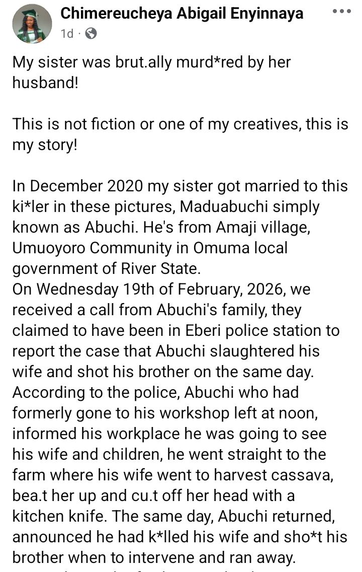 Taking to Facebook on Monday, February 24, Chimereucheya, shared her pain over the brutal k!lling of her sister, describing Abuchi as a beast.
