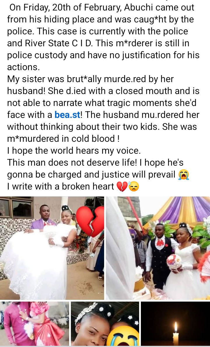 A Nigerian lady, Chimereucheya Abigail Enyinnaya, has recounted the tragic story of how her sister was allegedl  k!lled by her husband, Abuchi.