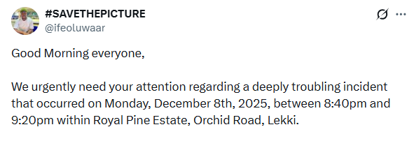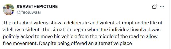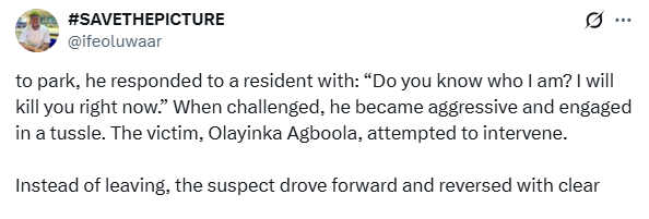 “The situation began when the individual involved was politely asked to move his vehicle from the middle of the road to allow free movement. Despite being offered an alternative place to park, he responded to a resident with, ‘Do you know who I am? I will kill you right now,” Ifeoluwa narrated.