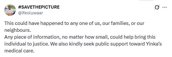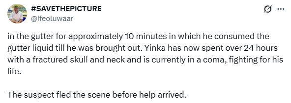 “While residents tried to stop him and prevent his escape, Yinka attempted to restrain him, but the suspect sped off with him hanging onto the steering wheel. He then slammed the brakes, throwing Yinka violently onto the pavement and into a gutter, leaving him unconscious,” the post read.