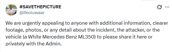 According to @Ifeoluwaar, Agboola attempted to restrain the driver, but the suspect sped off with him clinging to the steering wheel before knocking him against a pavement.