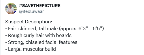 The X user described the fleeing driver as fair-skinned, tall, with curly hair, strong, chiseled facial features and muscular built.