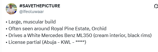 One @Ifeoluwaar, who raised the alarm in a series of posts on X, disclosed that residents found the suspect’s vehicle (a white Mercedes Benz ML350) obstructing the road and offered him an alternative parking spot.