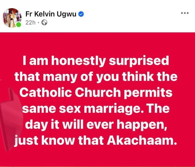Fr. Ugwu, who is known for his strong conservative theological views and frequent online commentary, made the statement while reacting to ongoing global conversations about sexuality, inclusivity, and doctrinal reform within the Roman Catholic Church. His remarks, shared via his verified social media platform, quickly went viral, drawing both support and backlash from Catholics and non-Catholics alike.