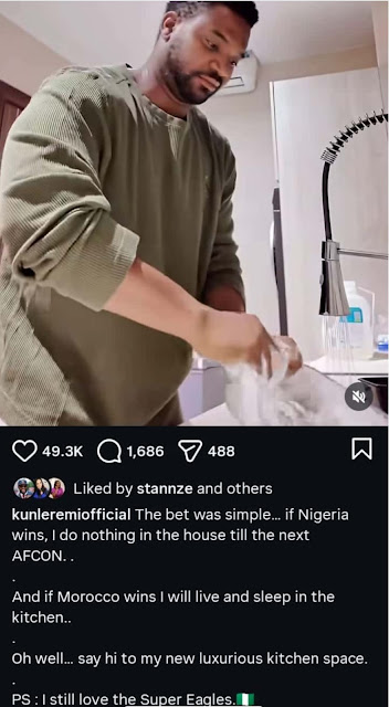 With Nigeria’s loss, Kunle humorously accepted his fate, admitting that he would now be relocating to the kitchen as agreed. His post quickly went viral, drawing amused reactions from fans and fellow Nollywood celebrities who flooded the comment section with jokes and playful remarks.
