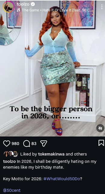 From the reactions, one thing is clear: Toolz’s unapologetic 2026 resolution has struck a nerve—ushering in a wave of relatable humour, savage energy, and 50-Cent-level pettiness.