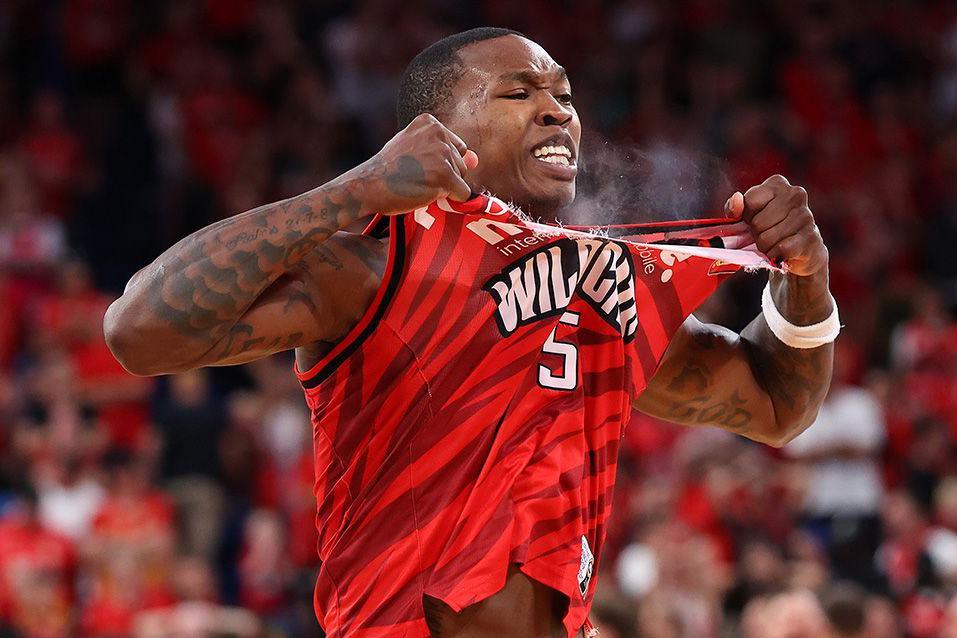 Kristian Doolittle rips his basketball vest in frustration after the Wildcats lose an NBL match against the Adelaide 36ers in Perth, Australia. Photo by Paul Kane