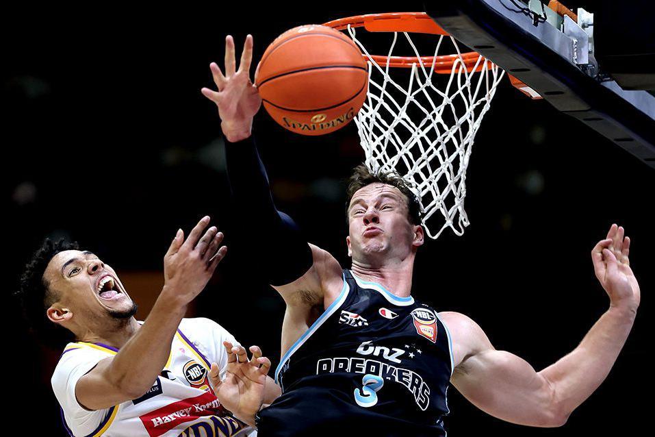 The Sydney Kings’ Jaylin Galloway shoots under pressure from the NZ Breaker’s Sam Mennenga at Claudelands Arena, in Hamilton, New Zealand. Photo by Phil Walter