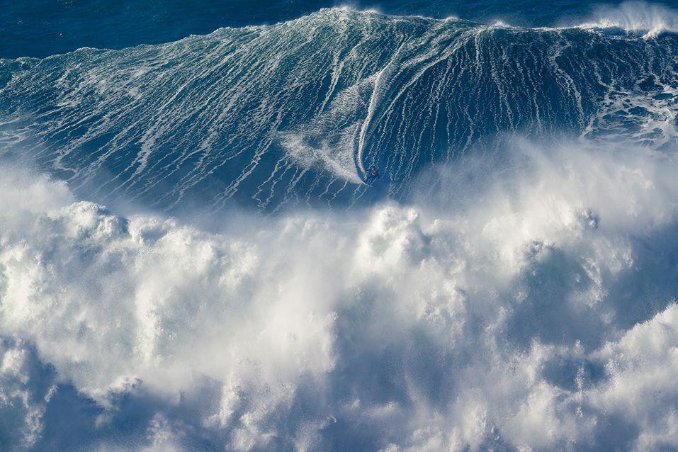 A surfer – centre of picture – rides a towering wave during a big waves surfing session at Nazare, Portugal. Photo by David Ramos