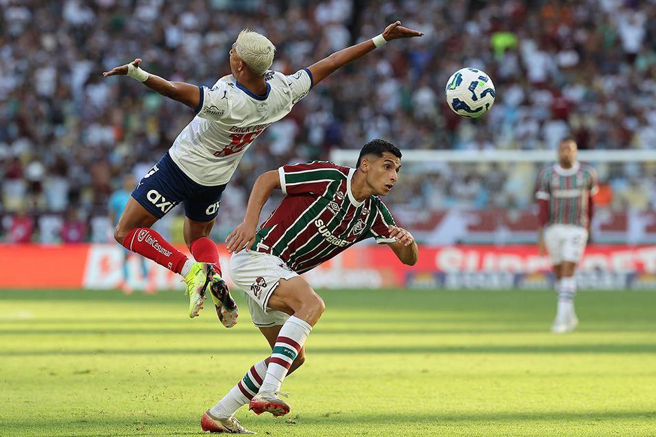 Bahia’s Erick Pulga competes for the ball with Fluminense’s Kevin Serna as part of the Brasileirao match in Rio de Janeiro. Photo by Wagner Meier