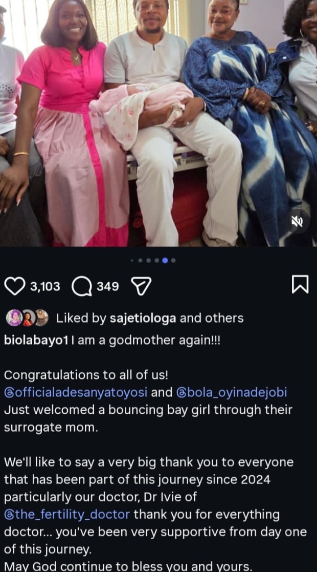 “I am a godmother again!!! Congratulations to all of us! @officialadesanyatoyosi and @bola_oyinadejust welcomed a bouncing bay girl through their surrogate mom. We want to say a very big thank you to everyone who has been part of this journey since 2024, particularly our doctor, Dr Ivie of @the_fertility_doctor.