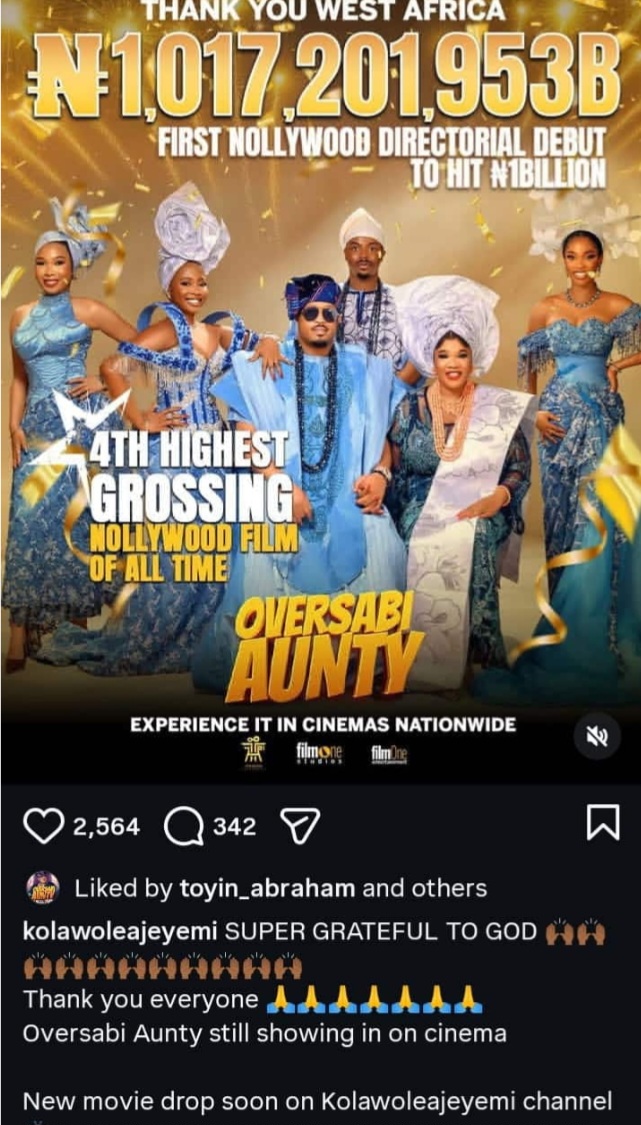 Meanwhile, Oversabi Aunty continues to enjoy impressive cinema patronage nationwide, with audiences praising its storyline, humor, and relatable themes. The film’s ₦1 billion box office record not only underscores Toyin Abraham’s star power but also highlights the growing commercial strength of Nollywood productions.
